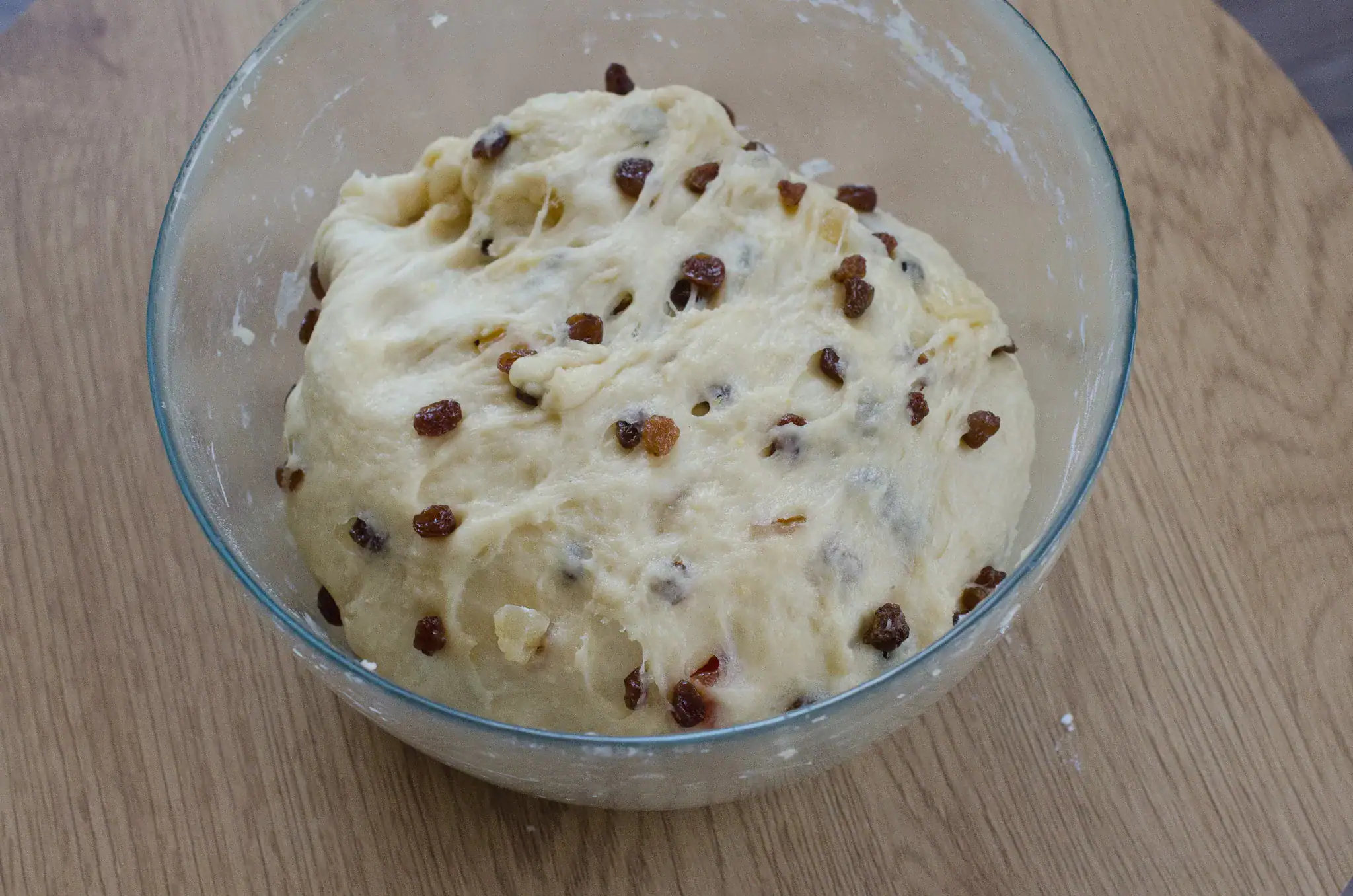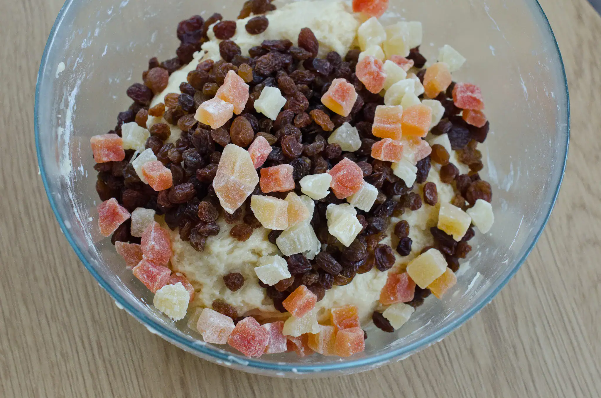 Do cesta nakoniec zapracujeme hrozienka a kandizované ovocie. Cesto zakryjeme a necháme pracovať približne 2 hodiny.