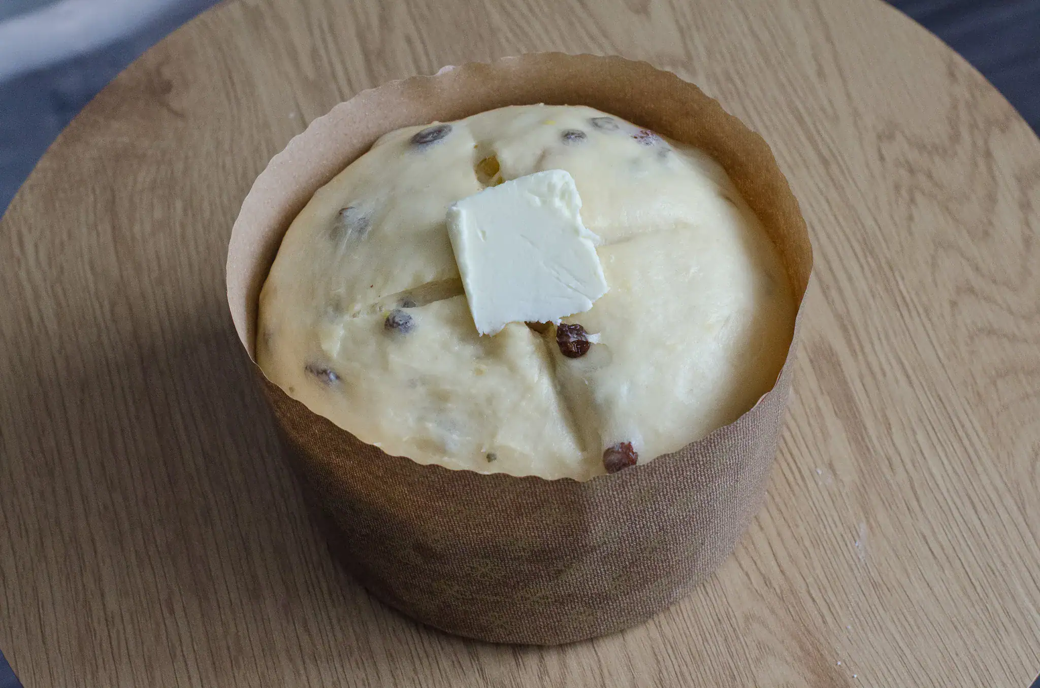 Keď cesto narastie, narežeme jeho povrch do kríža a do stredu položíme kúsok masla. Panettone pečieme pri 170°C približne 50 minút.