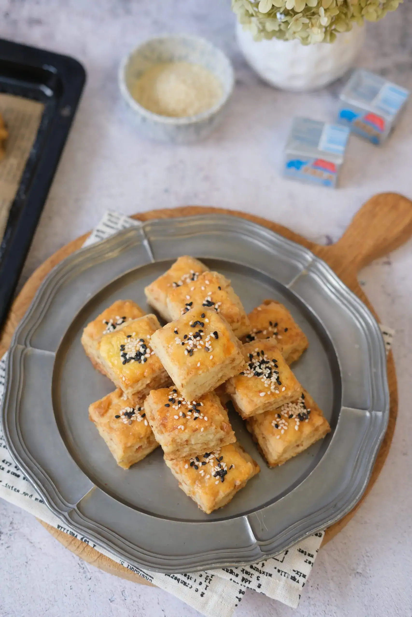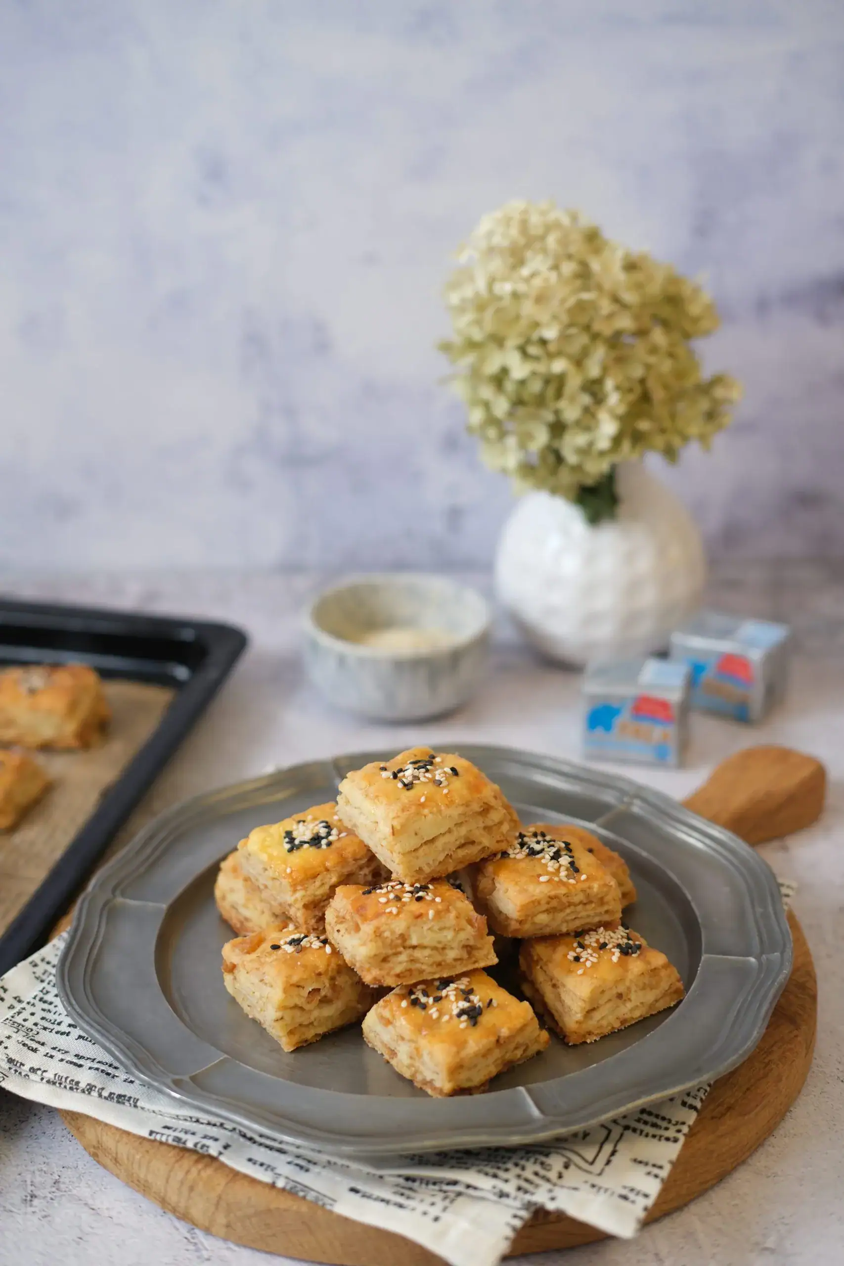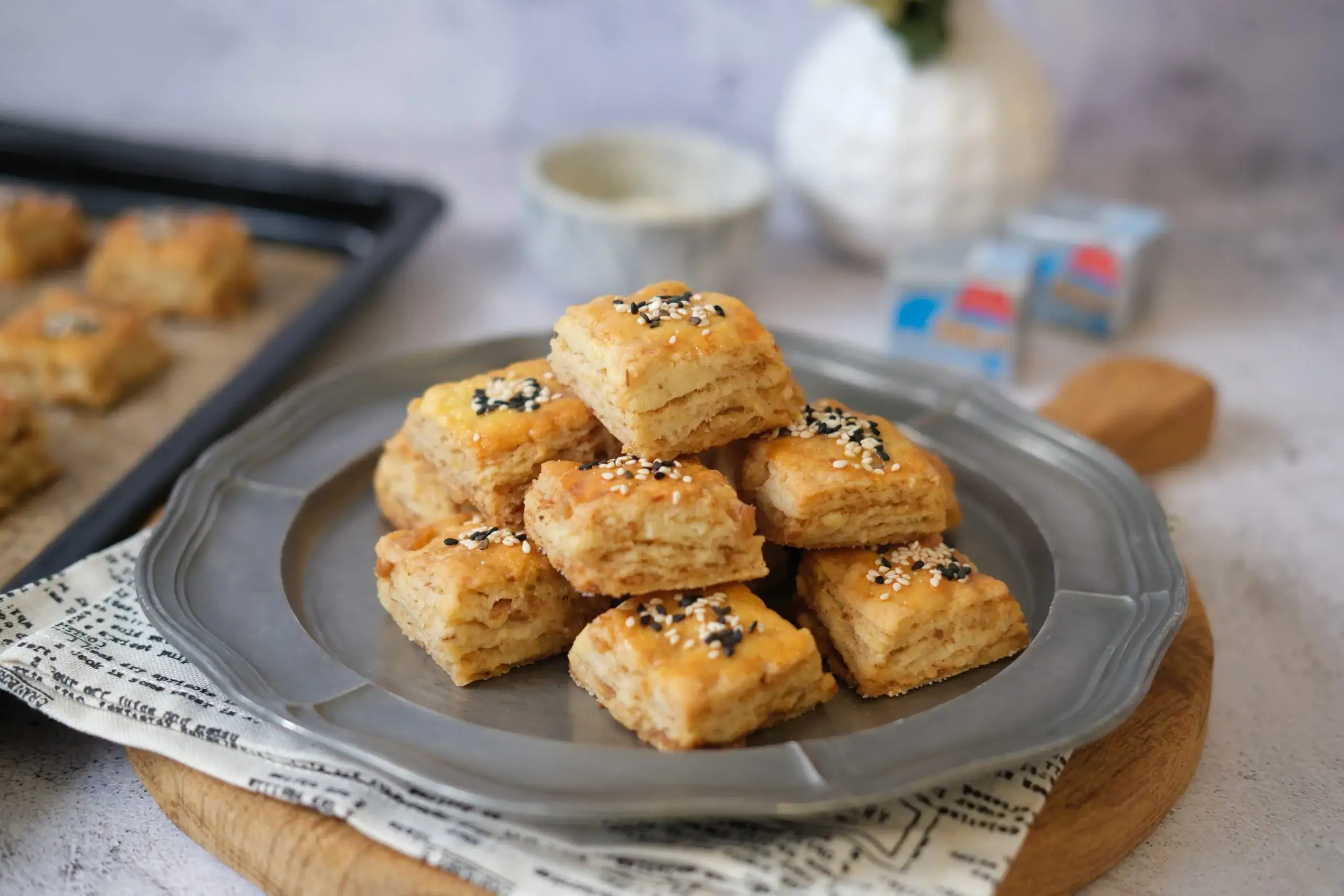 Na pomúčenej doske rozvaľkáme cesto, snažíme sa ho vytvarovať do tvaru štvorca. Potrieme ho pripravenou zmesou mletých oškvarkov. Ak sme mali slané oškvarky, nemusíme zmes soliť, ale ak boli neslané, posolíme ich.