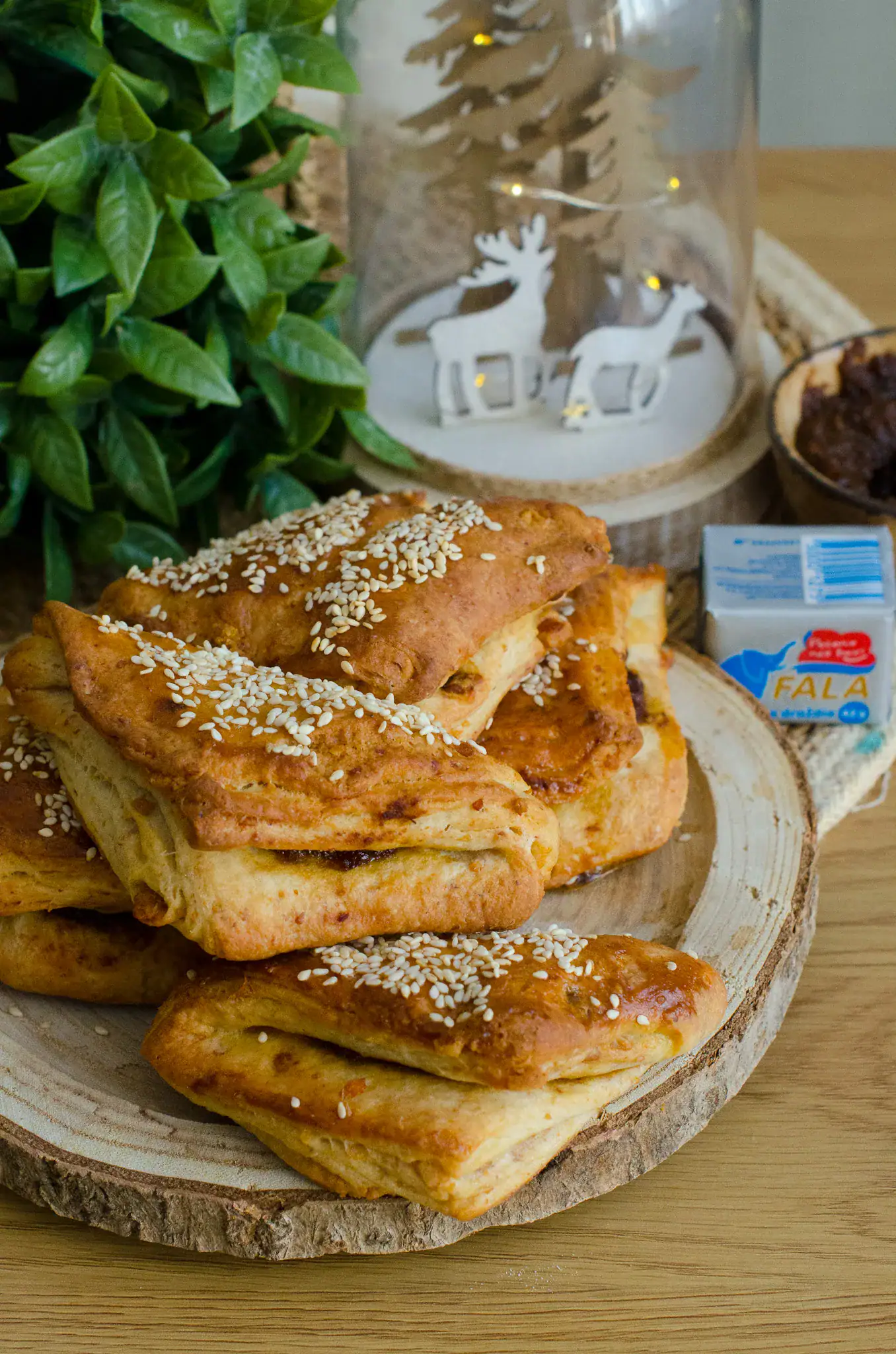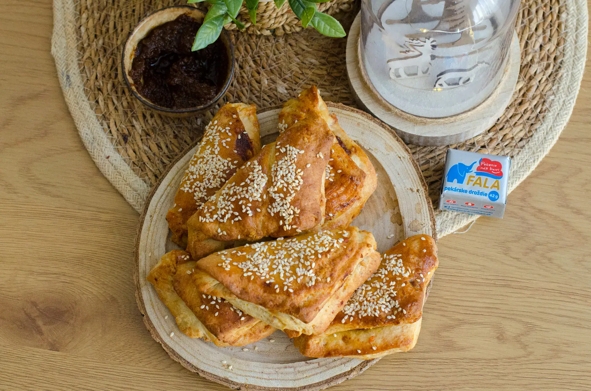 Preložíme do trojuholníka a hrany poriadne spojíme. Taštičky potrieme vajíčkom, posypeme sezamom a pečieme pri 180°C približne 20 minút.