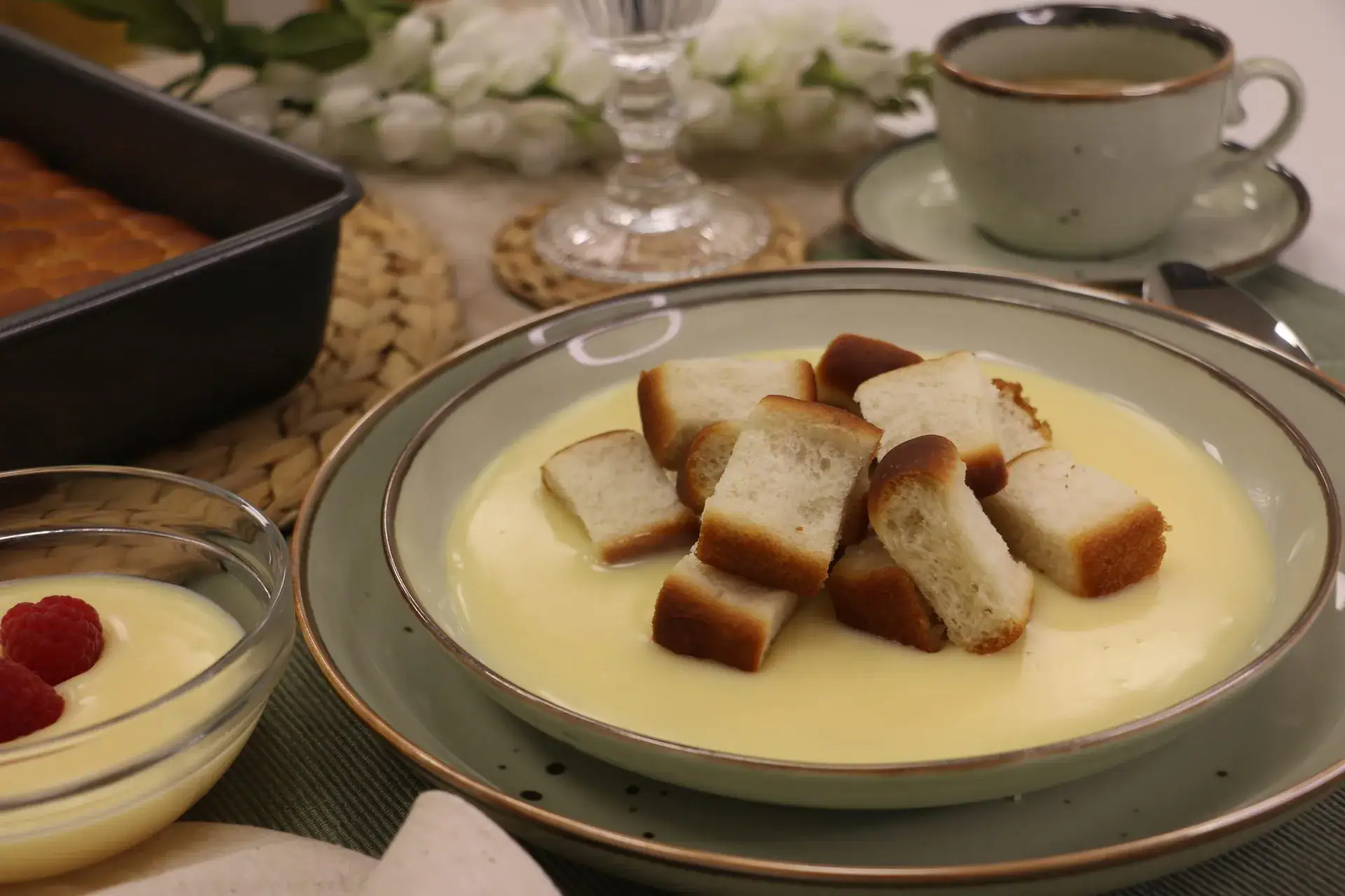 Uvaríme vanilkový puding (dávame viac mlieka, aby bola poleva redšia), buchtičky rozdelíme, uložíme na tanier a môžeme podávať.