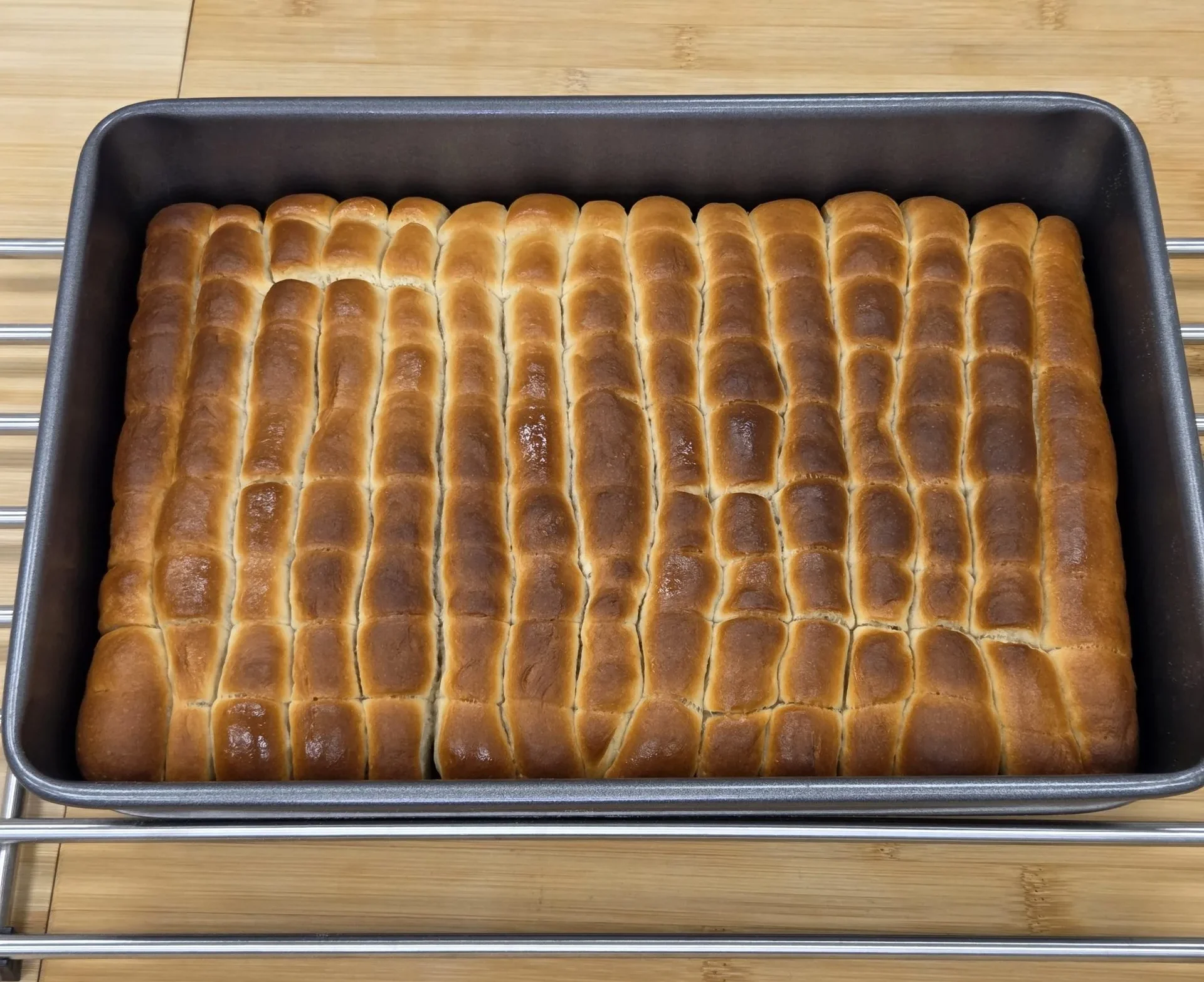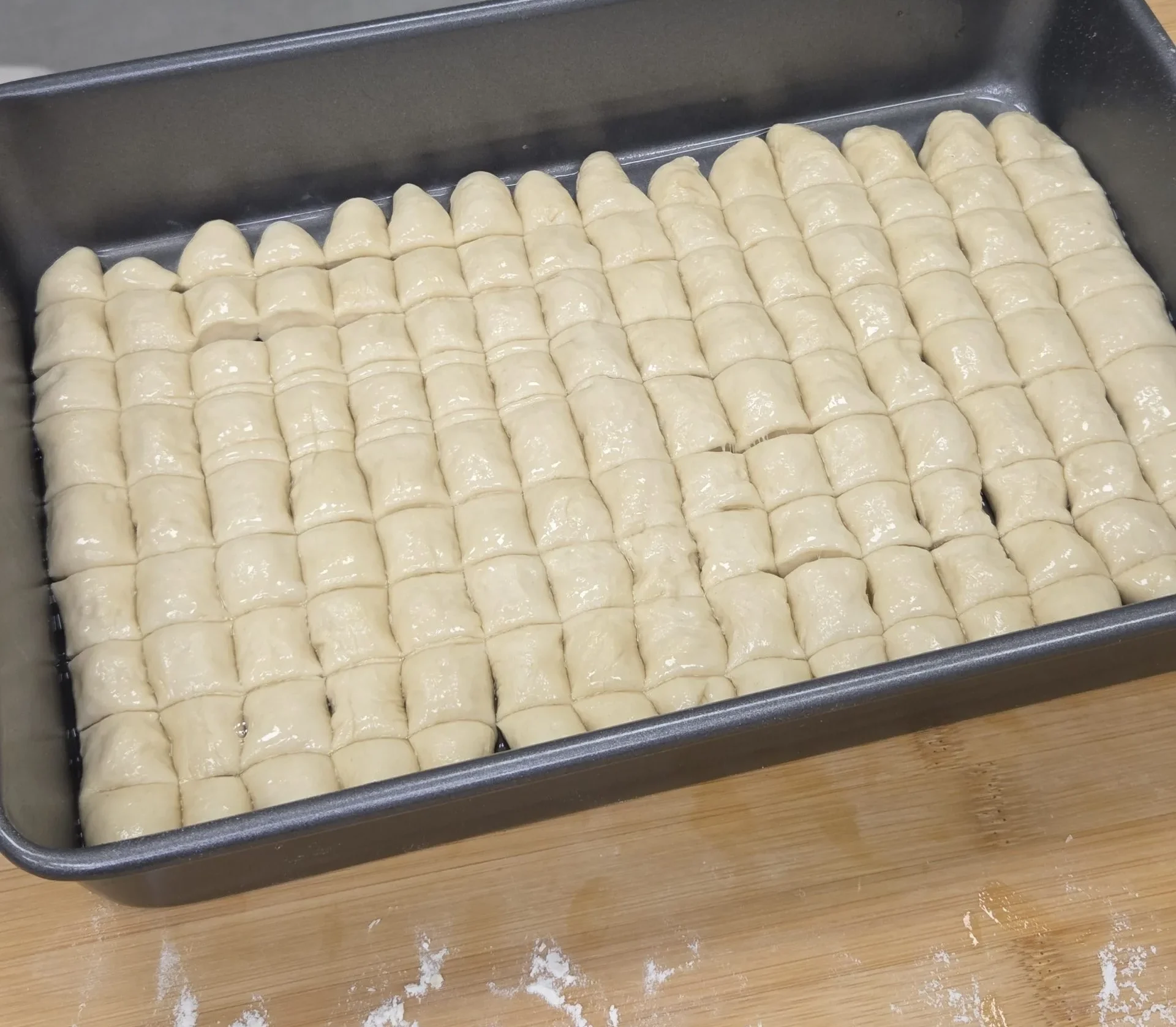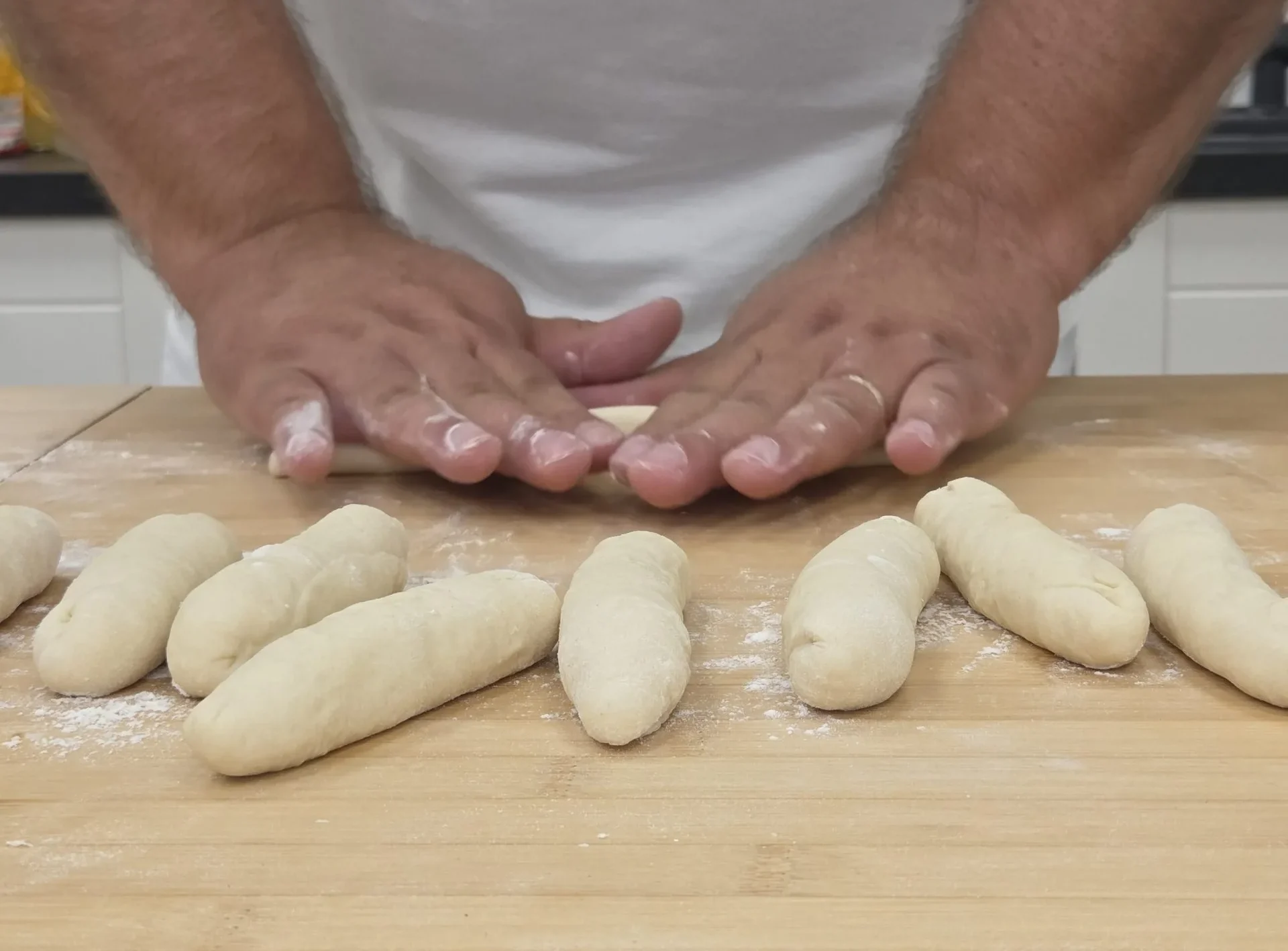 Vyzreté cesto si rozdelíme na 60 – 70 g kusy a vytvarujeme z nich veľké šúľance podľa šírky plechu alebo zapekacej misy. Každý jeden šúľanec dobre obalíme v oleji alebo potrieme olejom. Prikryjeme a necháme kysnúť 20 minút.
