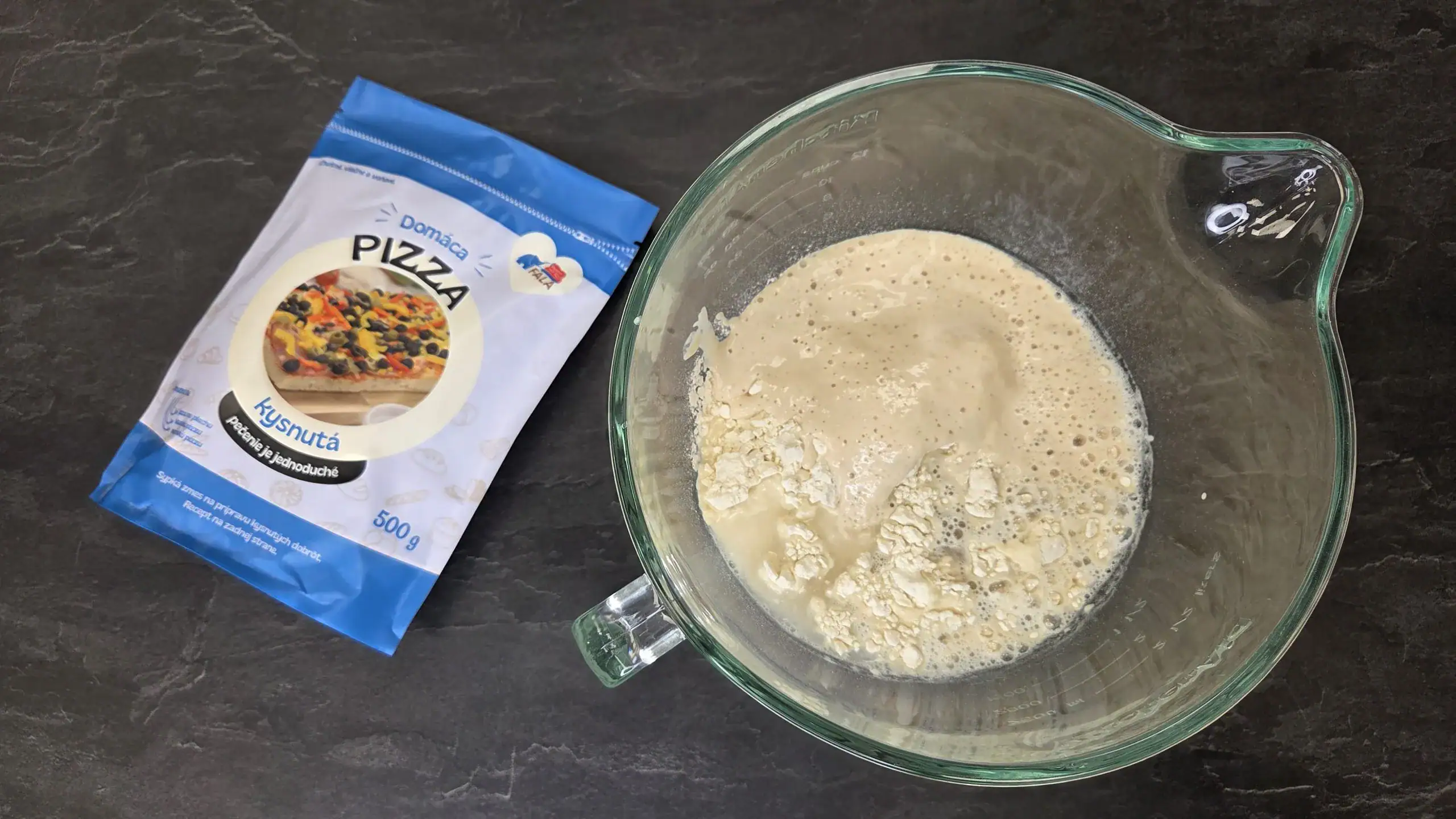 1. Odvážime si suroviny. V miske si zmiešame droždie FALA s 50 g vlažnej vody, pridáme lyžicu zmesi na Domácu pizzu a necháme postáť na teplom mieste 10 až 15 minút.