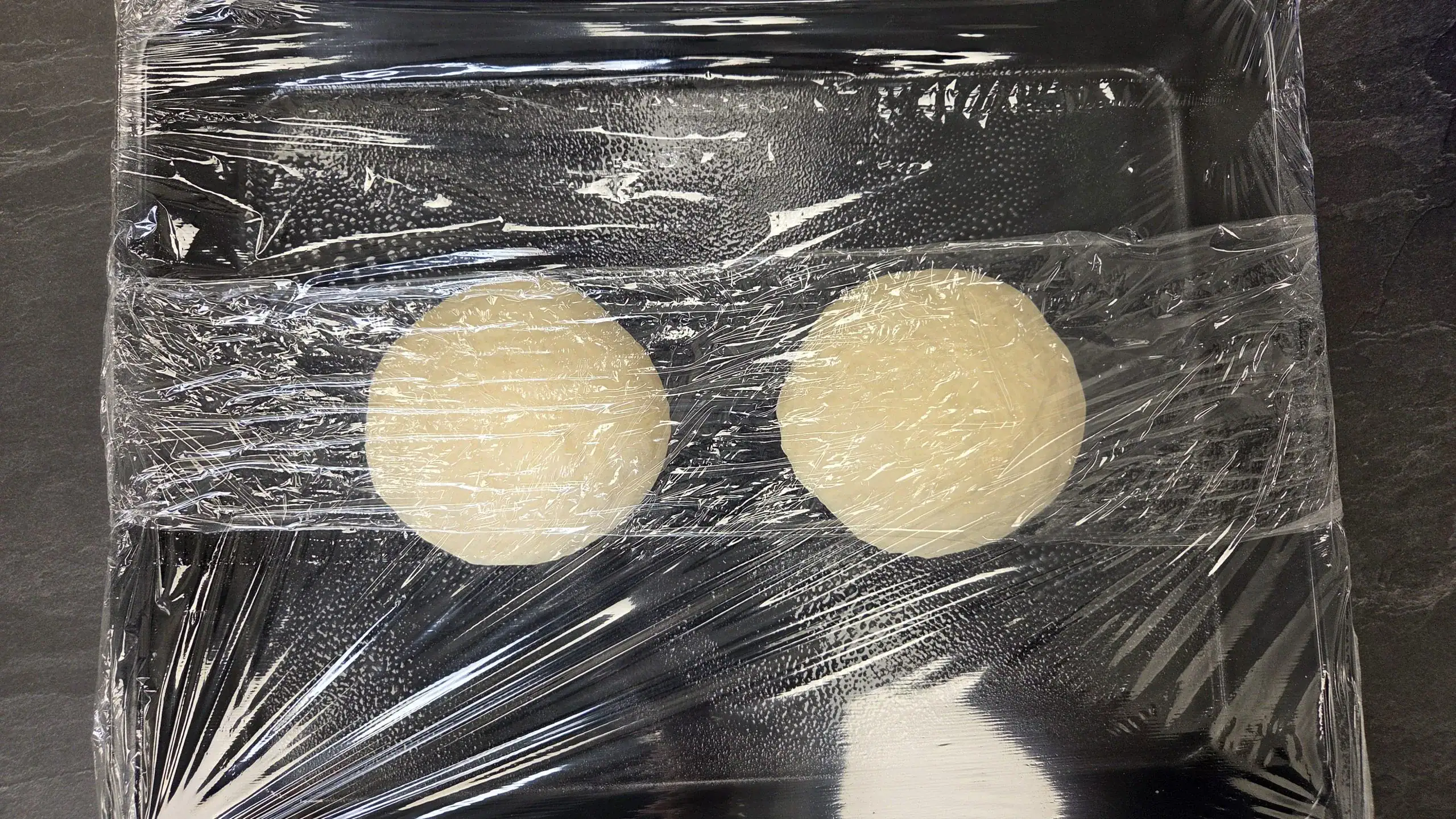 3. Cesto si rozdelíme na polku (2 x 400 g) a vytvarujeme bochníky. Bochníky položíme na naolejovaný plech a naolejujeme ich. Plech zakryjeme potravinárskou fóliou a cez noc necháme v chladničke.