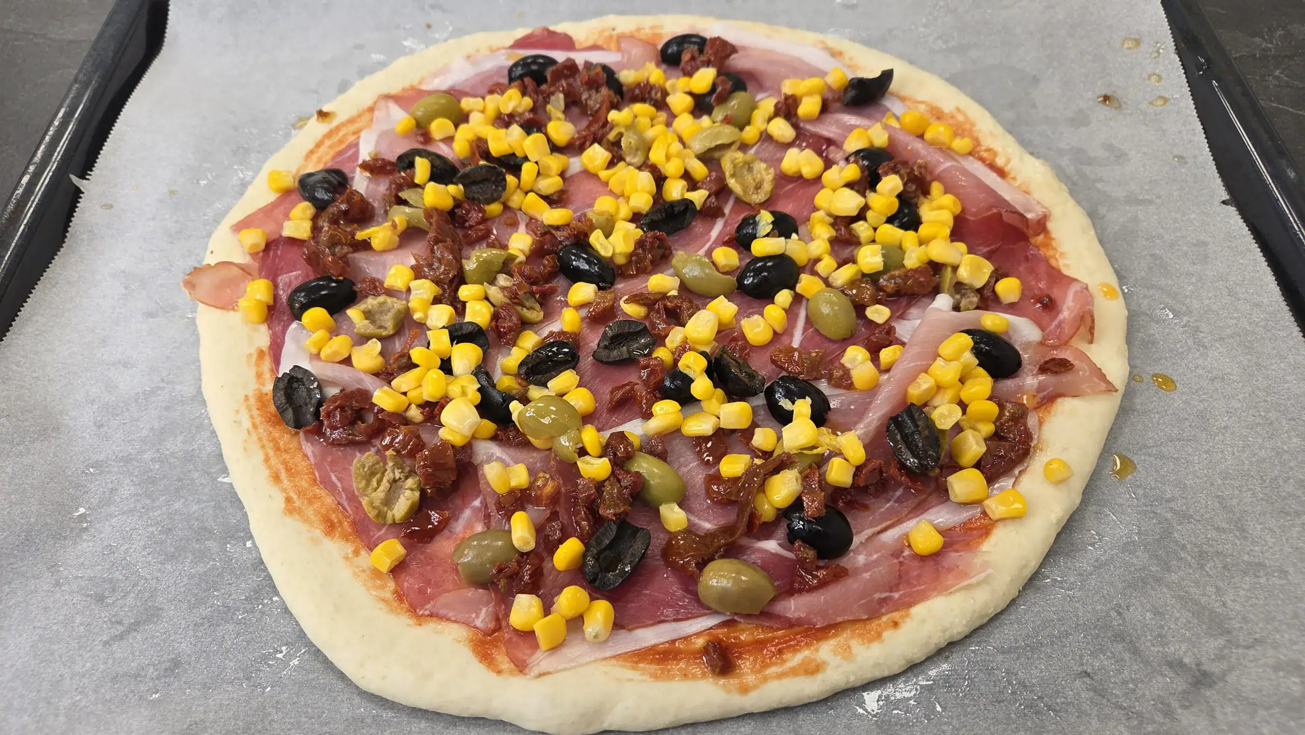 5. Po 2 hodinách si zoberieme bochník, opäť jemne premiesime, nechám postáť 10 minút a následne vyvaľkáme do kruhu, pričom cesto musí mať hrúbku približne 0,5 mm. Cesto preložíme na plech a na vrch pridáme ingrediencie podľa chuti.